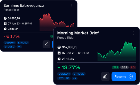 Quickly review your backtesting history. View key stats at a glance and dive deeper with a single click. Resume your session effortlessly to continue exploring your trading strategies.
